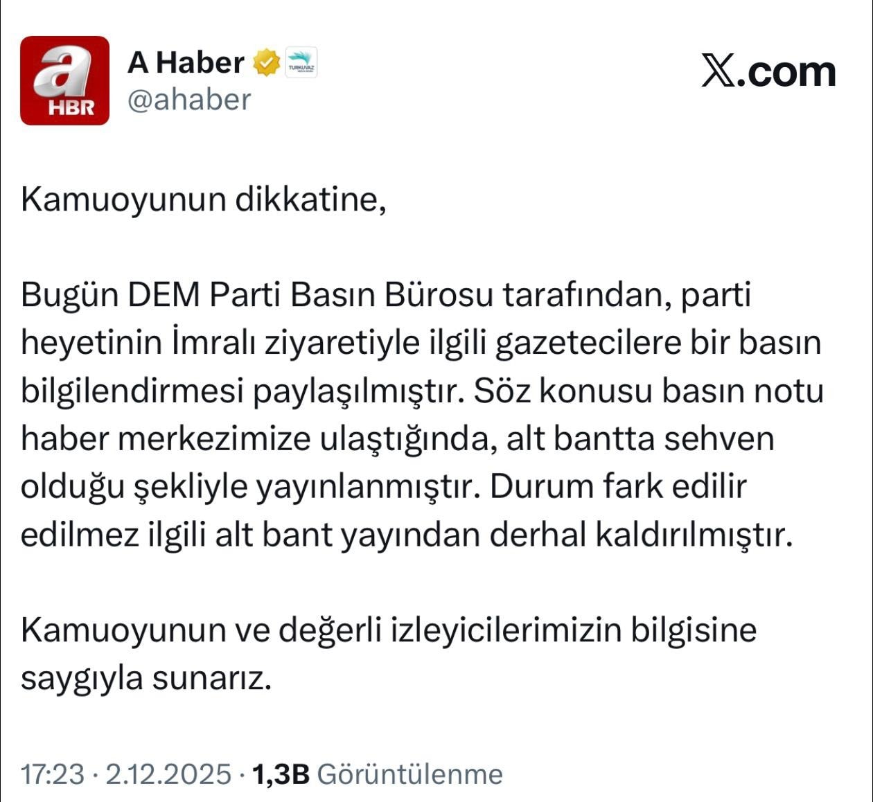 “Bugün DEM Parti Basın Bürosu tarafından, parti heyetinin İmralı ziyaretiyle ilgili gazetecilere bir basın bilgilendirmesi paylaşılmıştır. Söz konusu basın notu haber merkezimize ulaştığında, alt bantta sehven olduğu şekliyle yayınlanmıştır. Durum fark edilir edilmez ilgili alt bant yayından derhal kaldırılmıştır.”