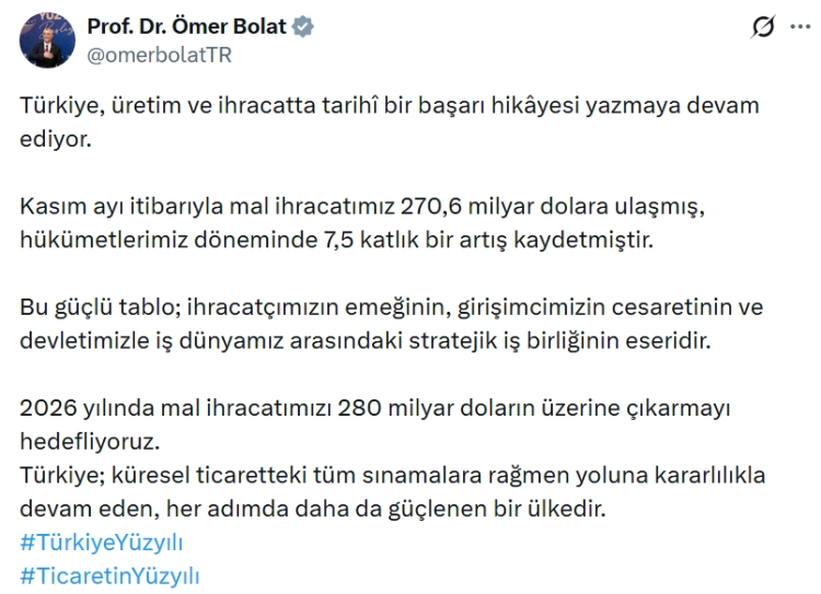Bakan Bolat, ihracattaki yükseliş trendinin sürdürüleceğini belirterek, 2026 yılı için mal ihracatında 280 milyar doların üzeri hedefini paylaştı. Türkiye’nin küresel ticaretin zorlu koşullarına rağmen yoluna kararlılıkla devam ettiğini vurgulayan Bolat, her adımda daha güçlü bir ekonomik yapı inşa edildiğini kaydetti.